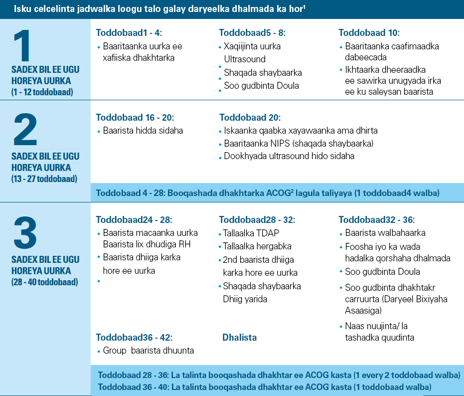 Booqashooyinka joogtada ah ee dhalamada iyo kuwa hore waxay ka caawinayaan dhakhtarkaaga ama adeeg bixiyahaaga inay la socdaan caafimaadka iyo koriimada ilmaha.